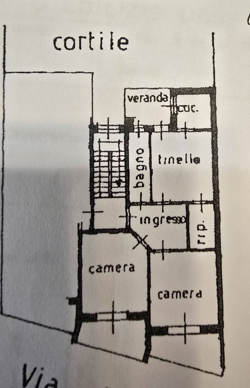 INGRESSO, 2 ampie CAMERE matrimoniali, TINELLO con CUCININO, BAGNO finestrato, RIPOSTIGLIO, BALCONE, VERANDA, CANTINA.